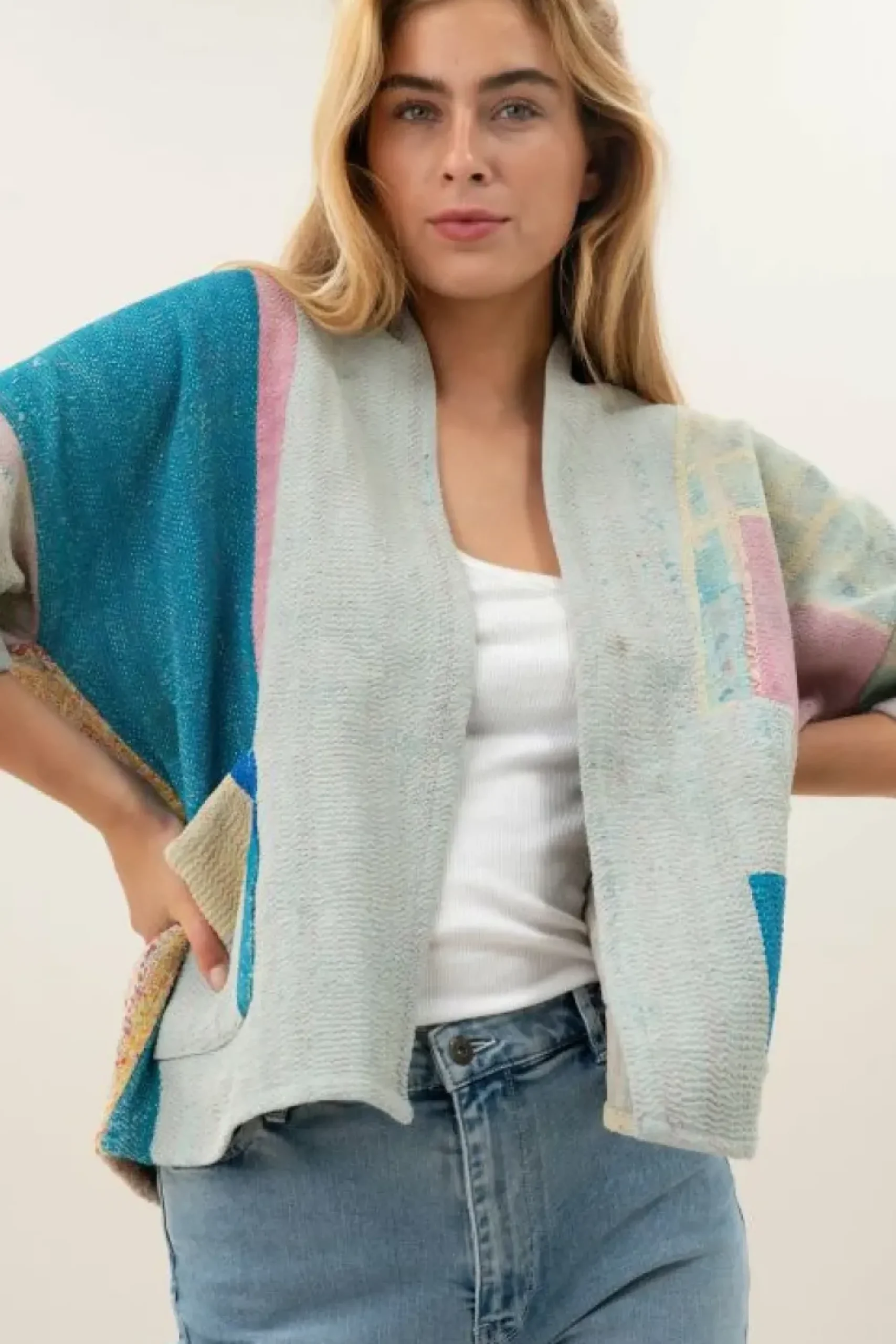 Deze collectie hebben we weer prachtige sustainable antic jackets toegevoegd, gemaakt van oude katoenen sari’s. Na het gebruik van de sari’s zijn er dekens van gemaakt. Van deze dekens hebben wij de antic jackets gemaakt. Elke antic jacket is uniek en heeft dus een andere print. De antic jackets zijn geupcycled en daarom sustainable. De jacket valt tot aan de heup en heeft driekwart mouwen en een laag ingezette schoudernaden. Het jasje is reversible en dus aan beide kanten draagbaar (zie afbeelding). Om deze aan beide kant te kunnen dragen dient alleen het by-bar necklabel eruit gehaald te worden. Dit is makkelijk te verwijderen met een torn mesje. Jackets, gemaakt van oude, katoenen sari’s gedragen door Indiase vrouwen. Na het dragen worden deze sari’s aan elkaar gestikt tot een stevig kleed wat de basis vormt van onze prachtige antic jackets. Alle sari’s hebben een ander design, waardoor elke antic jacket uniek is.