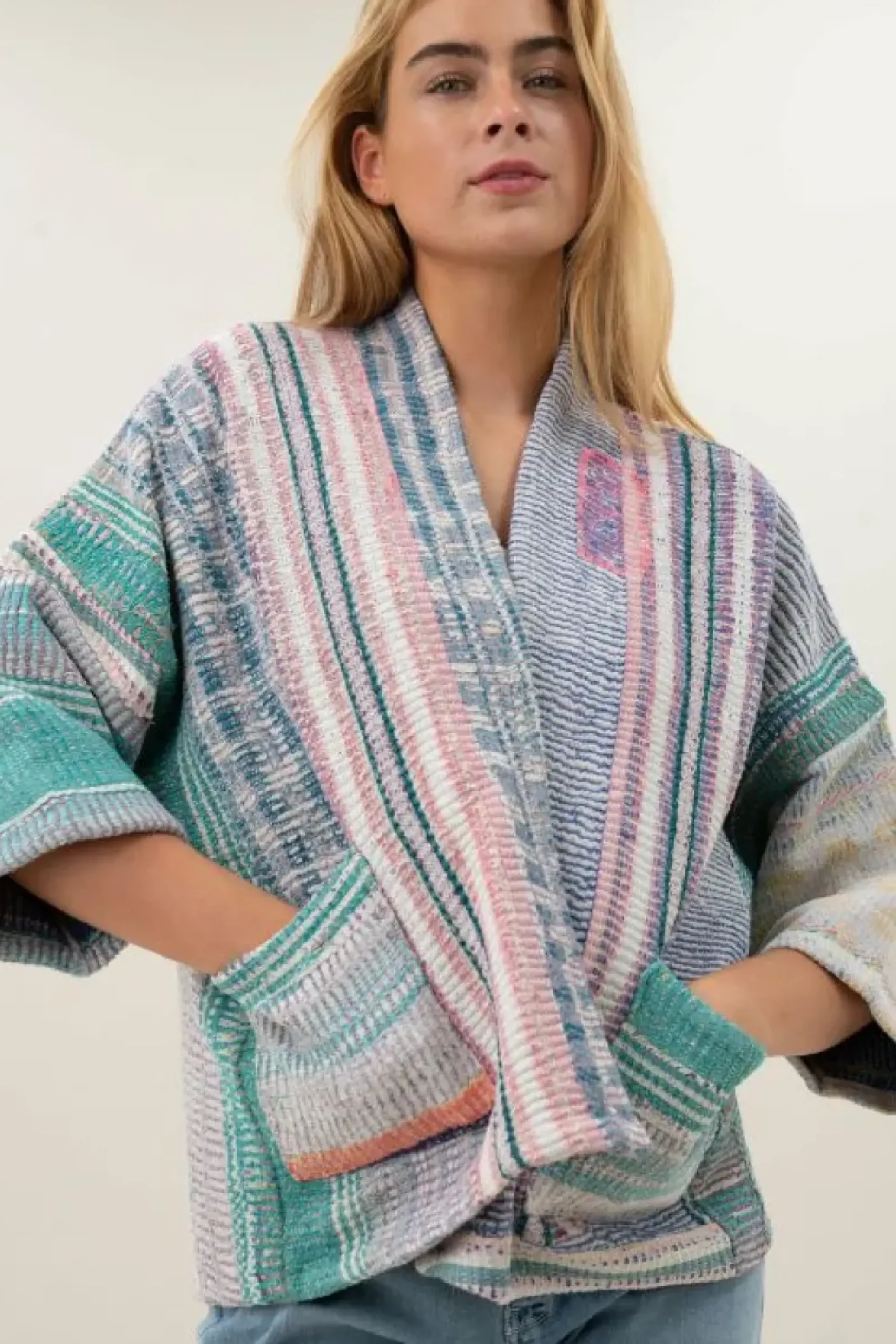 Deze collectie hebben we weer prachtige sustainable antic jackets toegevoegd, gemaakt van oude katoenen sari’s. Na het gebruik van de sari’s zijn er dekens van gemaakt. Van deze dekens hebben wij de antic jackets gemaakt. Elke antic jacket is uniek en heeft dus een andere print. De antic jackets zijn geupcycled en daarom sustainable. De jacket valt tot aan de heup en heeft driekwart mouwen en een laag ingezette schoudernaden. Het jasje is reversible en dus aan beide kanten draagbaar (zie afbeelding). Om deze aan beide kant te kunnen dragen dient alleen het by-bar necklabel eruit gehaald te worden. Dit is makkelijk te verwijderen met een torn mesje. Jackets, gemaakt van oude, katoenen sari’s gedragen door Indiase vrouwen. Na het dragen worden deze sari’s aan elkaar gestikt tot een stevig kleed wat de basis vormt van onze prachtige antic jackets. Alle sari’s hebben een ander design, waardoor elke antic jacket uniek is.