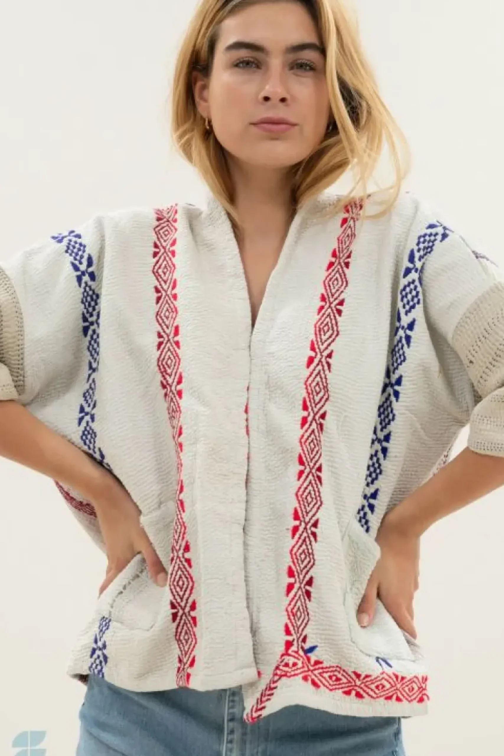 Deze collectie hebben we weer prachtige sustainable antic jackets toegevoegd, gemaakt van oude katoenen sari’s. Na het gebruik van de sari’s zijn er dekens van gemaakt. Van deze dekens hebben wij de antic jackets gemaakt. Elke antic jacket is uniek en heeft dus een andere print. De antic jackets zijn geupcycled en daarom sustainable. De jacket valt tot aan de heup en heeft driekwart mouwen en een laag ingezette schoudernaden. Het jasje is reversible en dus aan beide kanten draagbaar (zie afbeelding). Om deze aan beide kant te kunnen dragen dient alleen het by-bar necklabel eruit gehaald te worden. Dit is makkelijk te verwijderen met een torn mesje. Jackets, gemaakt van oude, katoenen sari’s gedragen door Indiase vrouwen. Na het dragen worden deze sari’s aan elkaar gestikt tot een stevig kleed wat de basis vormt van onze prachtige antic jackets. Alle sari’s hebben een ander design, waardoor elke antic jacket uniek is.