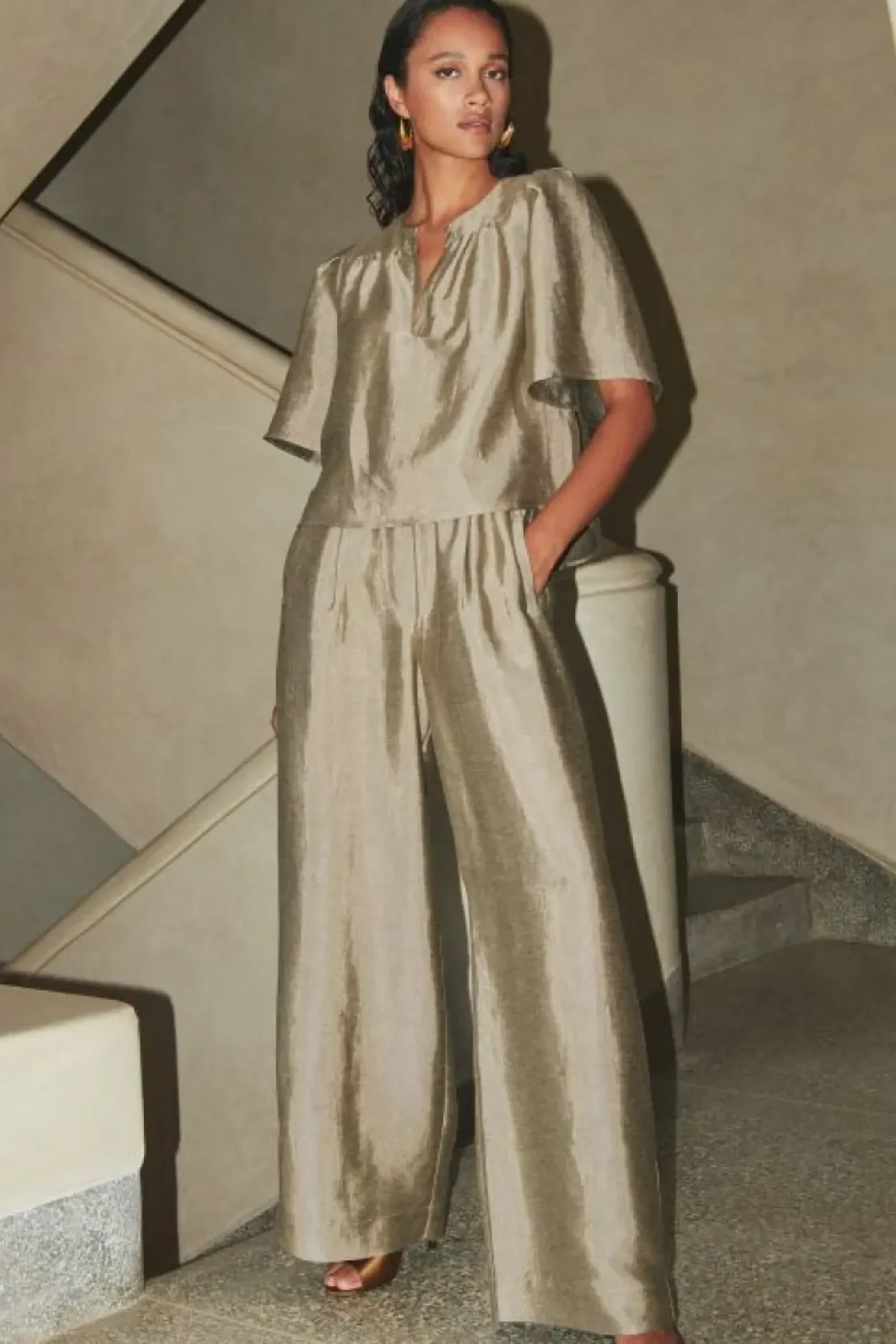 Maak kennis met de benji gloss pants! Deze elegangte broek met een hoge taille en rechte pasvorm biedt ultiem comfort met een elastieken band. De lange lengte en de gouden kleur geven je outfit een elegante look. Dankzij de verborgen steekzakken zijn je essentials altijd binnen handbereik. Combineer met de bijpassende blake gloss blouse voor een stijlvolle look.