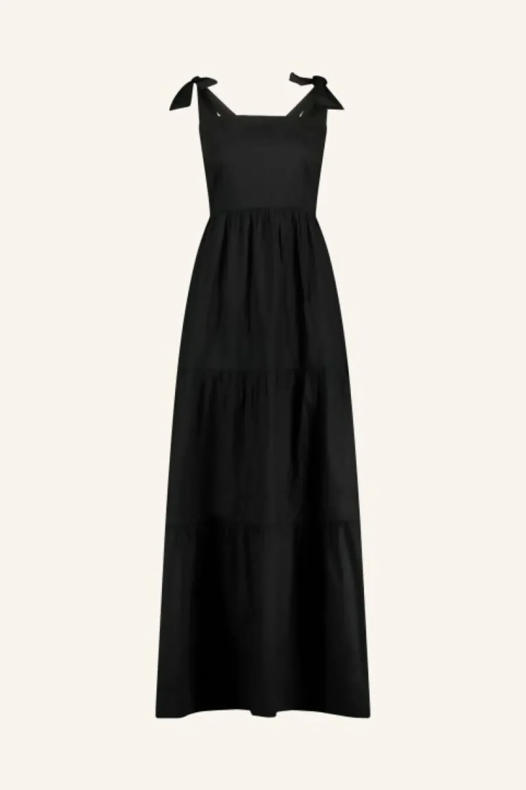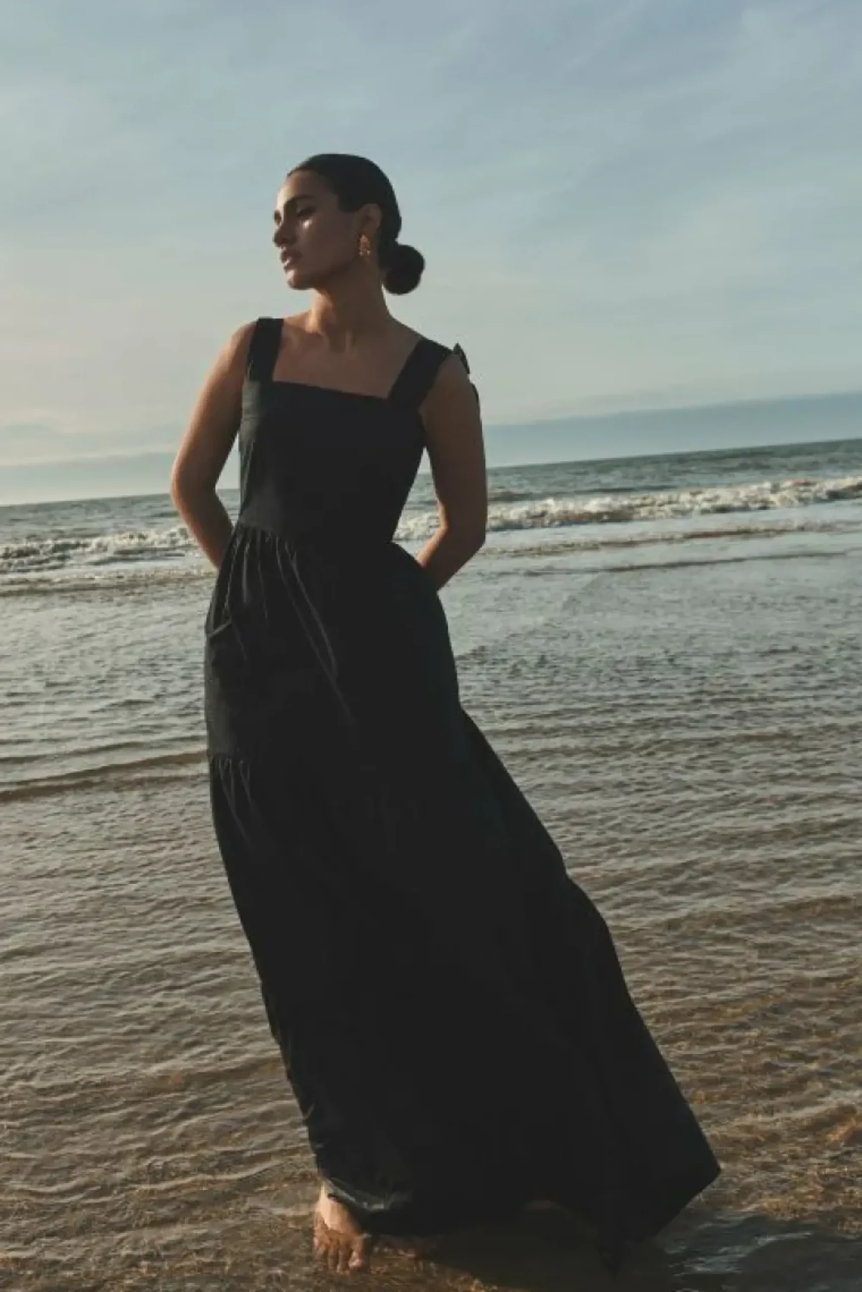 Sunshine & sophistication! De doah dress heeft een maxi lengte, een rechte halslijn, een uitlopend model en een smock detail op de achterzijde. De jurk heeft een black kleur met strikjes op de rug. De schouderbandjes zijn door middel van de strik te verstellen. Niet alleen stijlvol, maar ook praktisch. Verder draagt het comfortabel en is het gemaakt van een biologische katoen kwaliteit. Combineer het samen met jouw favoriete sieraden voor een sophisticated look!