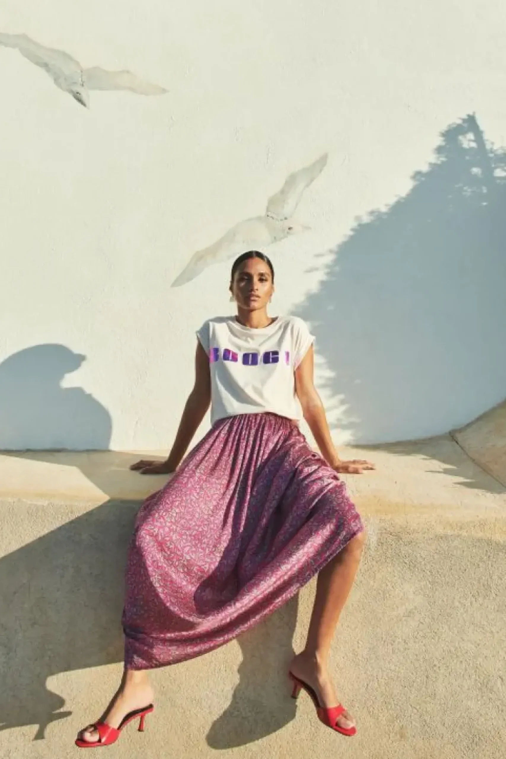 Let’s dance! De thelma boogie top heeft een rechte pasvorm, ronde halslijn en kleine kapmouwtjes. De top biedt een perfecte mix van comfort en elegantie. Gemaakt van hoogwaardig biologisch katoen met een sprankelende print van het woord ‘boogie’. Combineer de top met de nina saree skirt voor een elegante look.