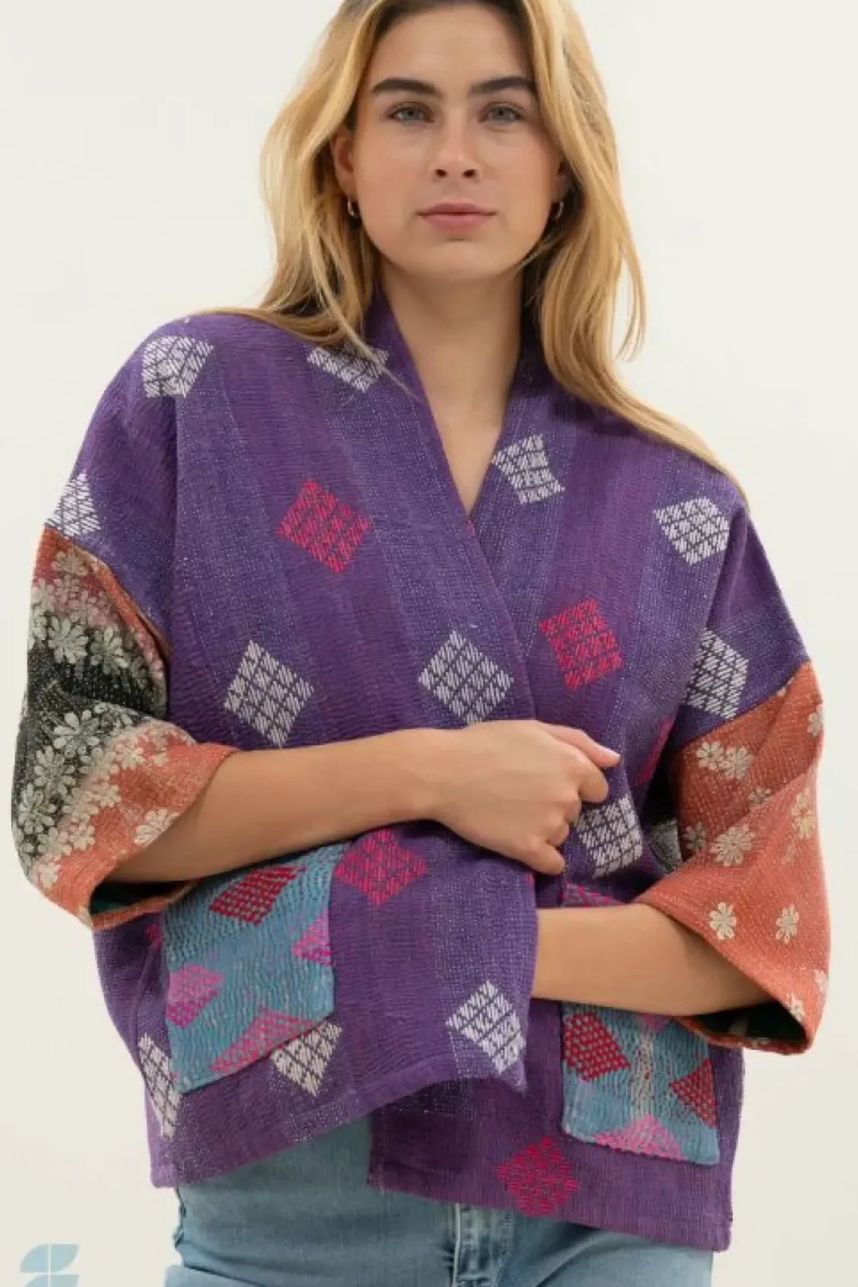 Deze collectie hebben we weer prachtige sustainable antic jackets toegevoegd, gemaakt van oude katoenen sari’s. Na het gebruik van de sari’s zijn er dekens van gemaakt. Van deze dekens hebben wij de antic jackets gemaakt. Elke antic jacket is uniek en heeft dus een andere print. De antic jackets zijn geupcycled en daarom sustainable. De jacket valt tot aan de heup en heeft driekwart mouwen en een laag ingezette schoudernaden. Het jasje is reversible en dus aan beide kanten draagbaar (zie afbeelding). Om deze aan beide kant te kunnen dragen dient alleen het by-bar necklabel eruit gehaald te worden. Dit is makkelijk te verwijderen met een torn mesje. Jackets, gemaakt van oude, katoenen sari’s gedragen door Indiase vrouwen. Na het dragen worden deze sari’s aan elkaar gestikt tot een stevig kleed wat de basis vormt van onze prachtige antic jackets. Alle sari’s hebben een ander design, waardoor elke antic jacket uniek is.
