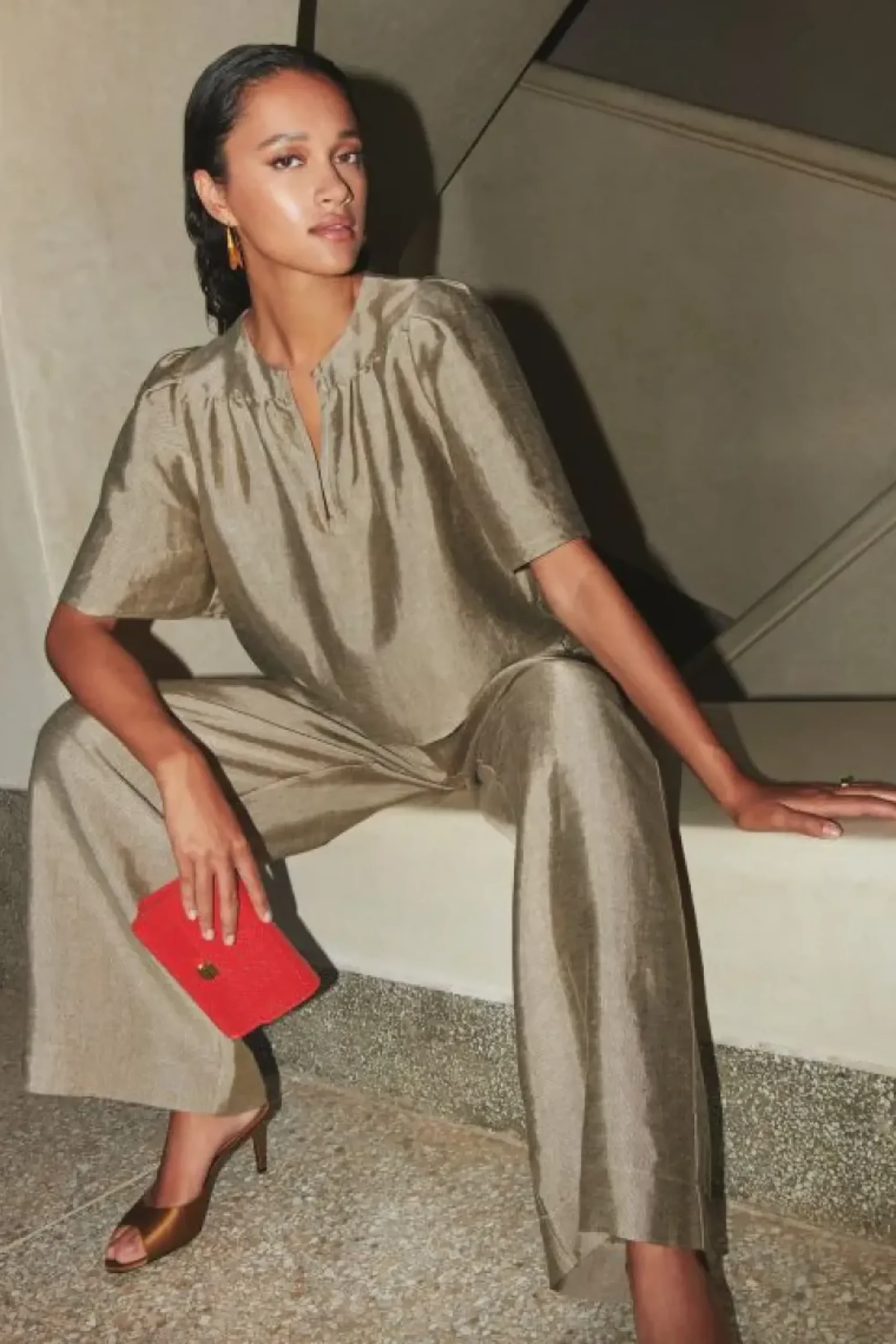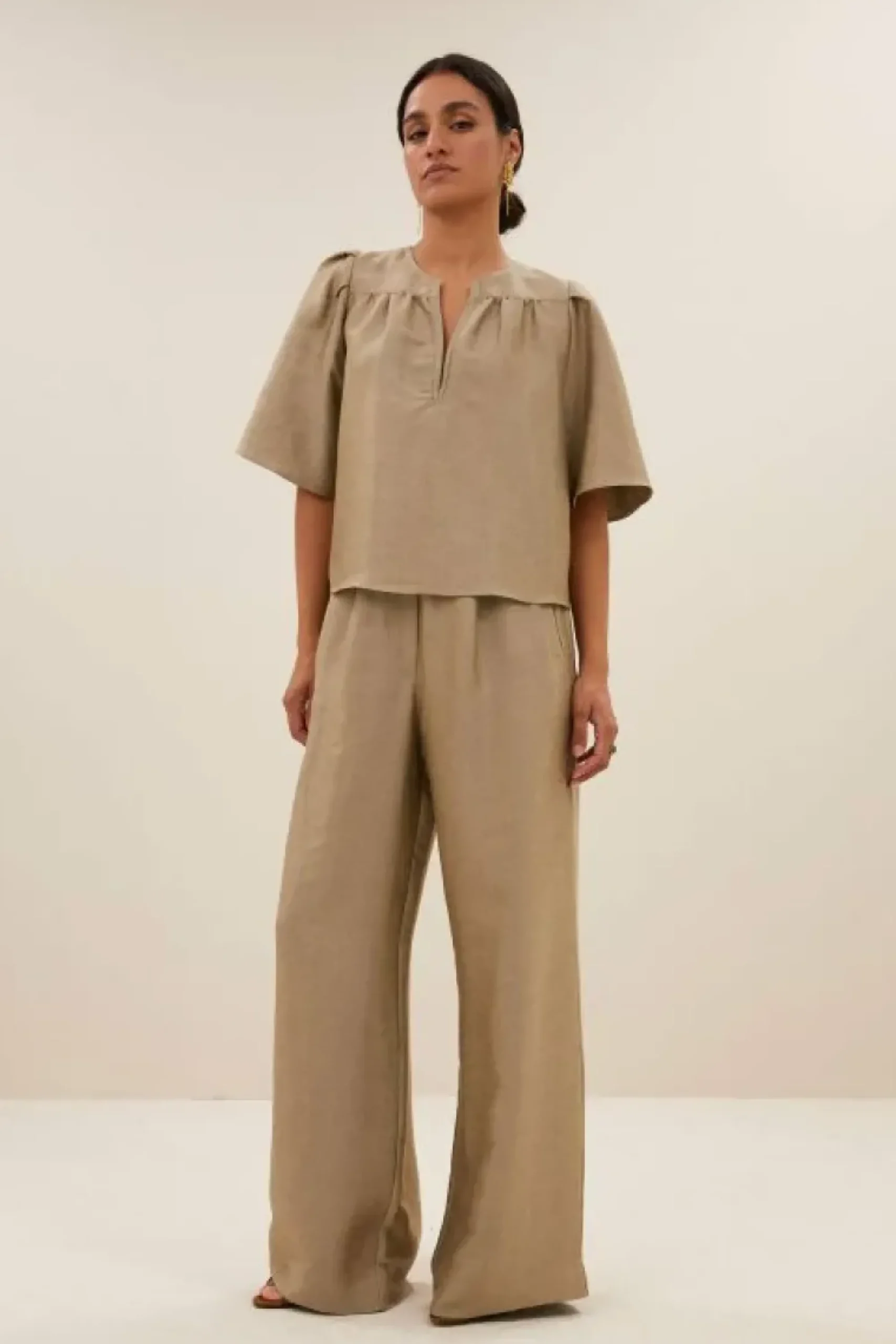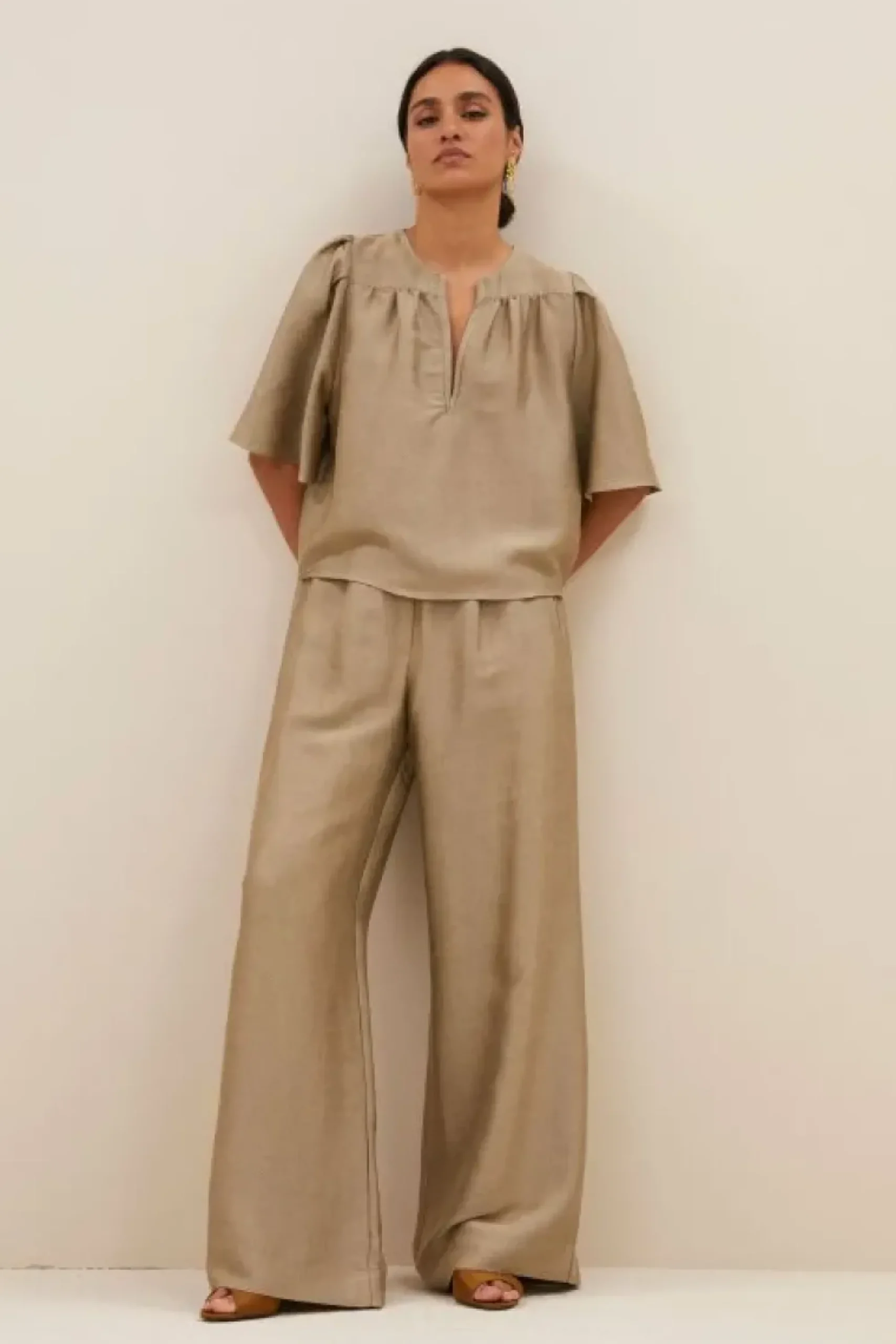 Deze stijlvolle blouse is een must-have in je garderobe! Met een elegante v-halslijn en plooien die je look een speelse twist geven. De blouse heeft een normale pasvorm en een korte fit. Combineer de blake gloss blouse met de benji gloss pants en je favoriete sieraden voor een elegante look.