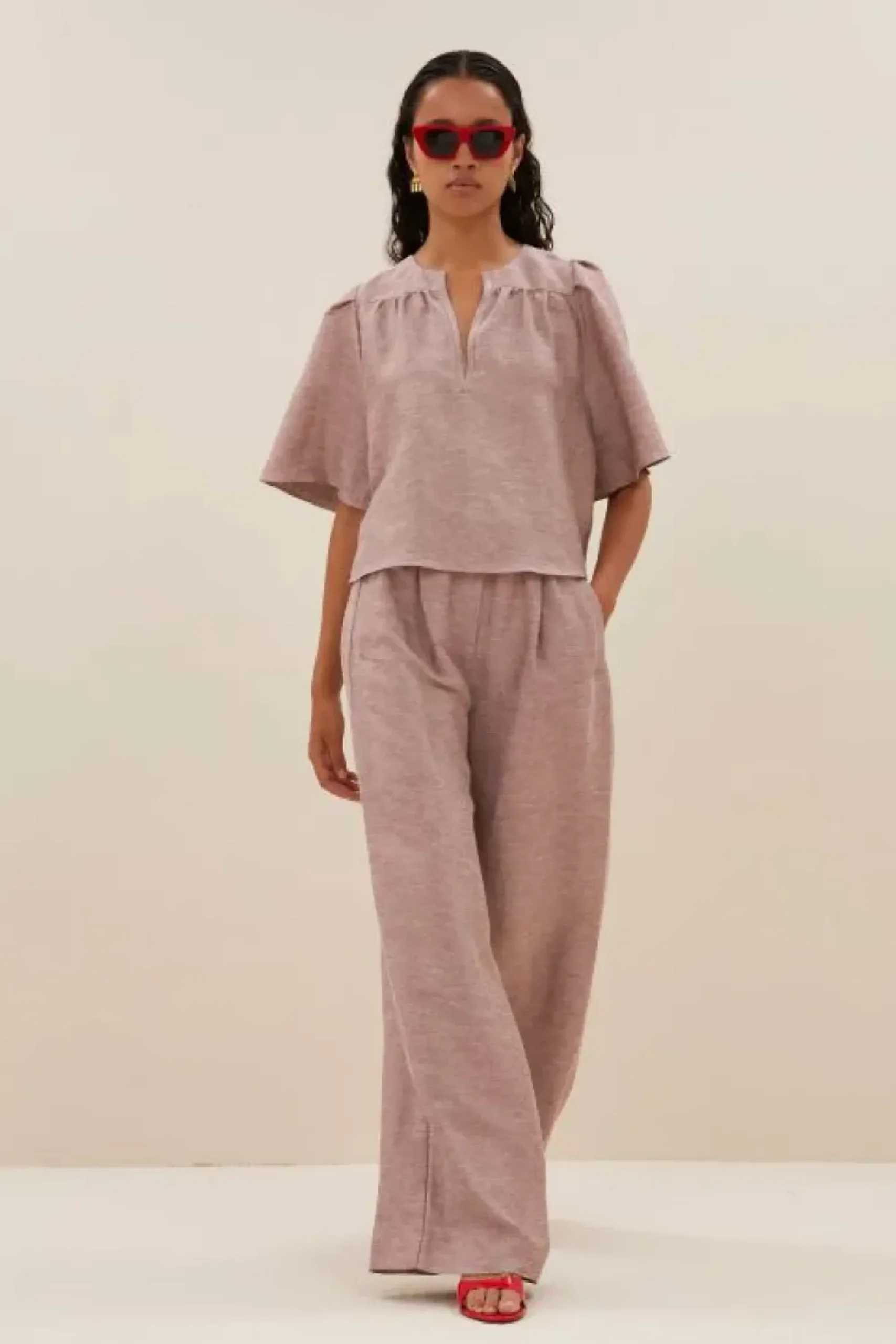 Deze stijlvolle blouse is een must-have in je garderobe! Met een elegante v-halslijn en plooien die je look een speelse twist geven. De blouse heeft een losse pasvorm en een korte fit. De achterkant van de blouse valt langer. Combineer de blake gloss blouse met de benji gloss pants en je favoriete sieraden voor een elegante look.