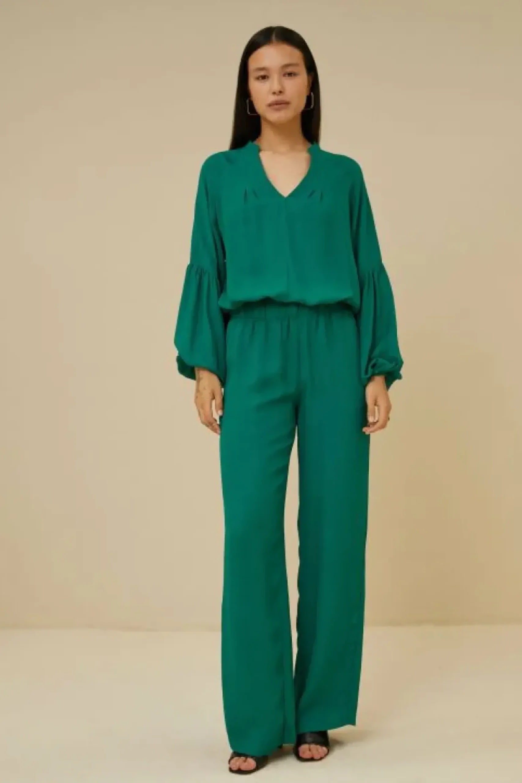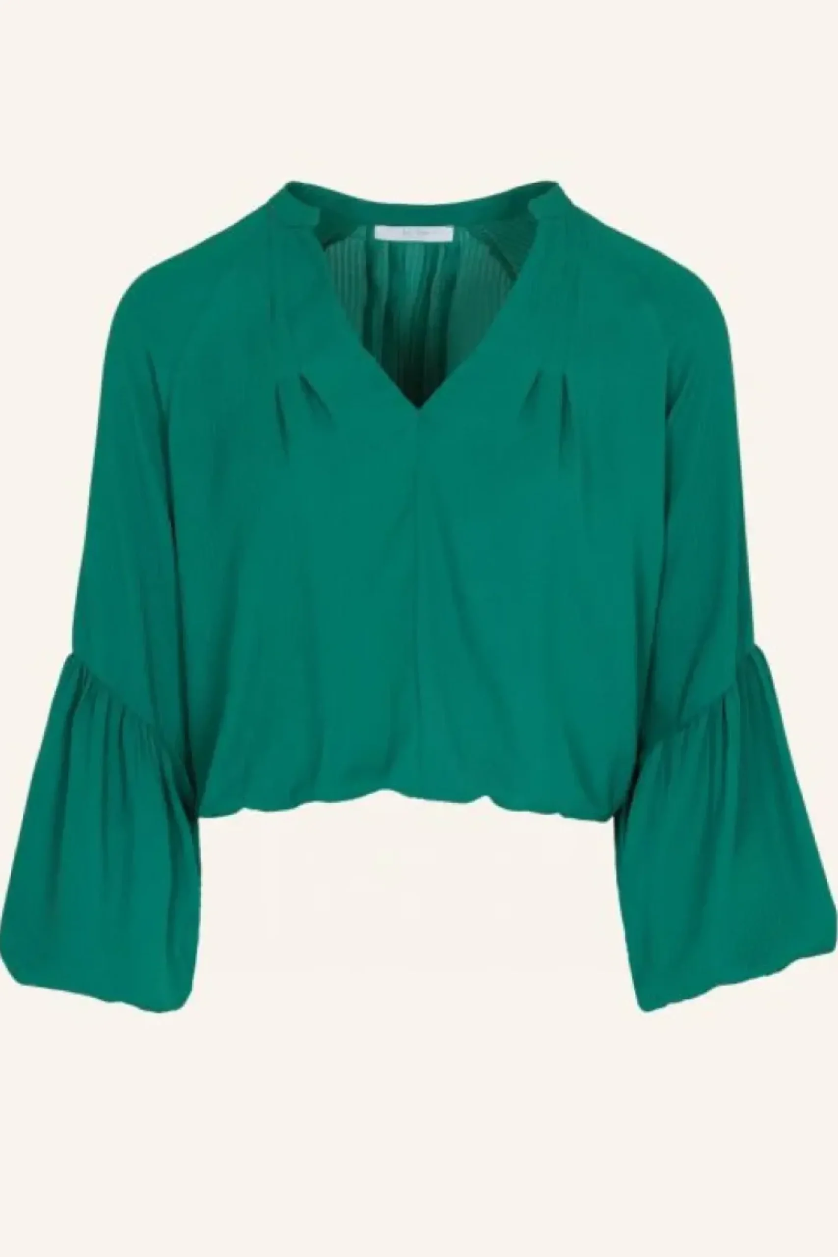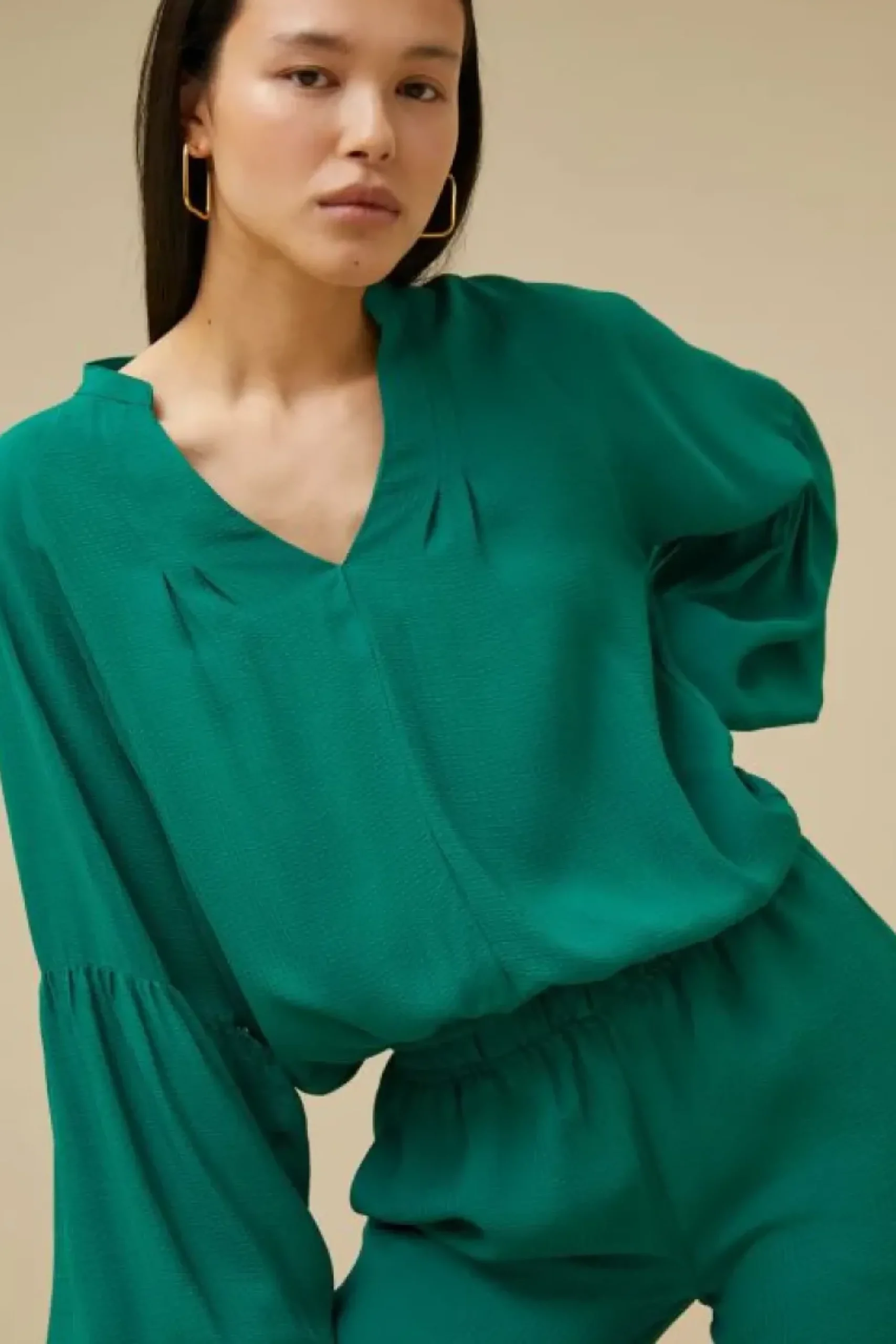 Met de vienna satin stripe blouse creëer je in no-time een geklede of een casual look. Deze blouse is gemaakt van een viscose kwaliteit in een evergreen tint, heeft een vrouwelijk v-halslijn, plooitjes, pofmouwen en een elastische band aan de onderzijde van de blouse. Draag met de robyn satin stripe pant om je look compleet te maken.