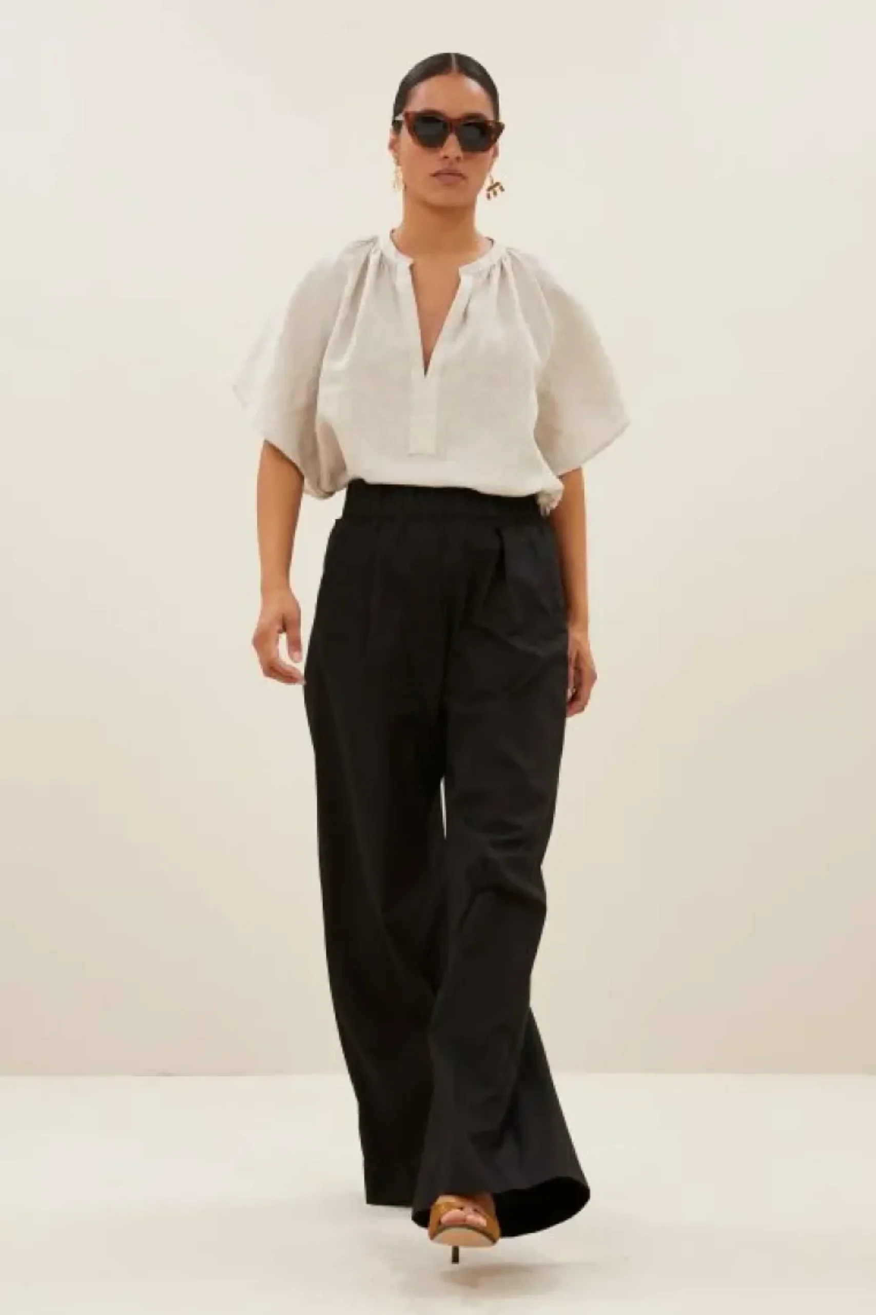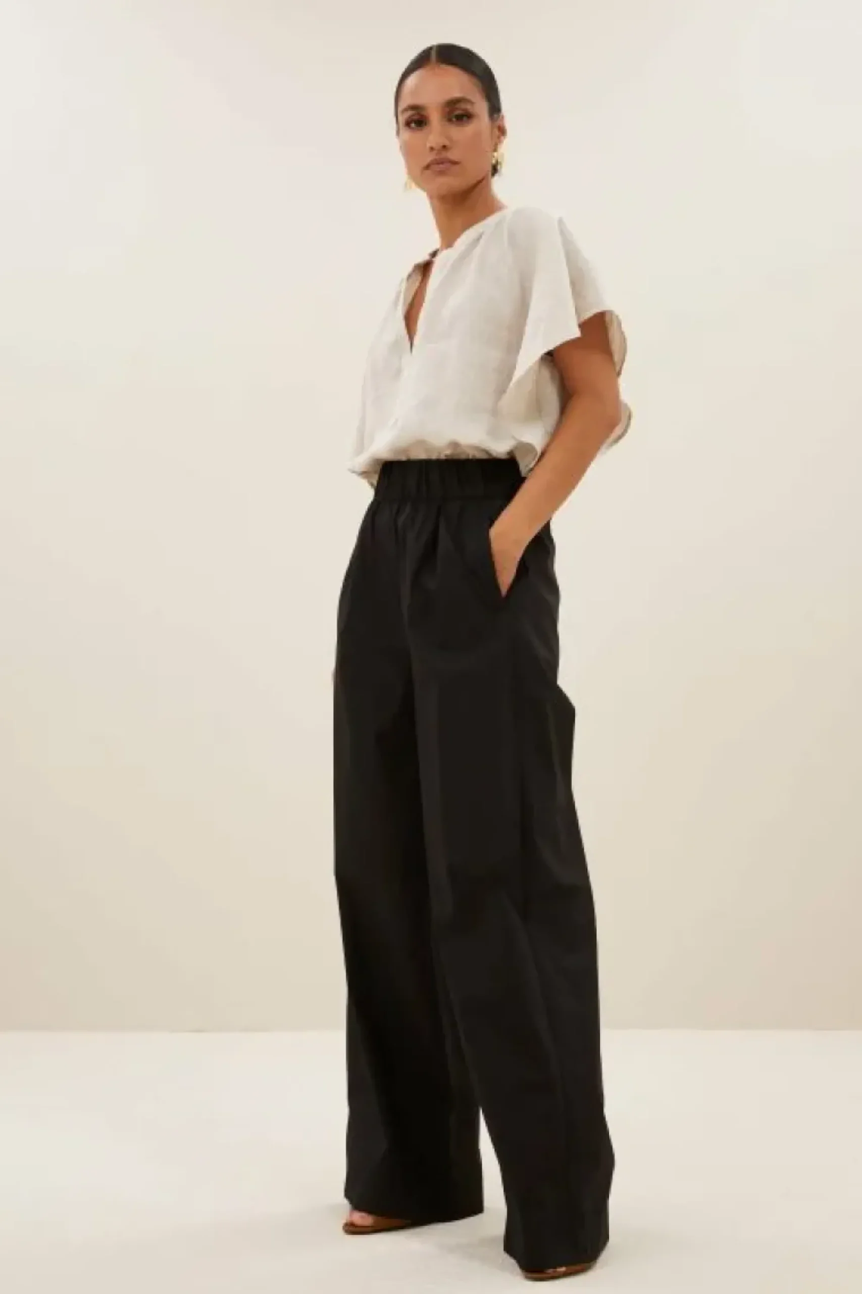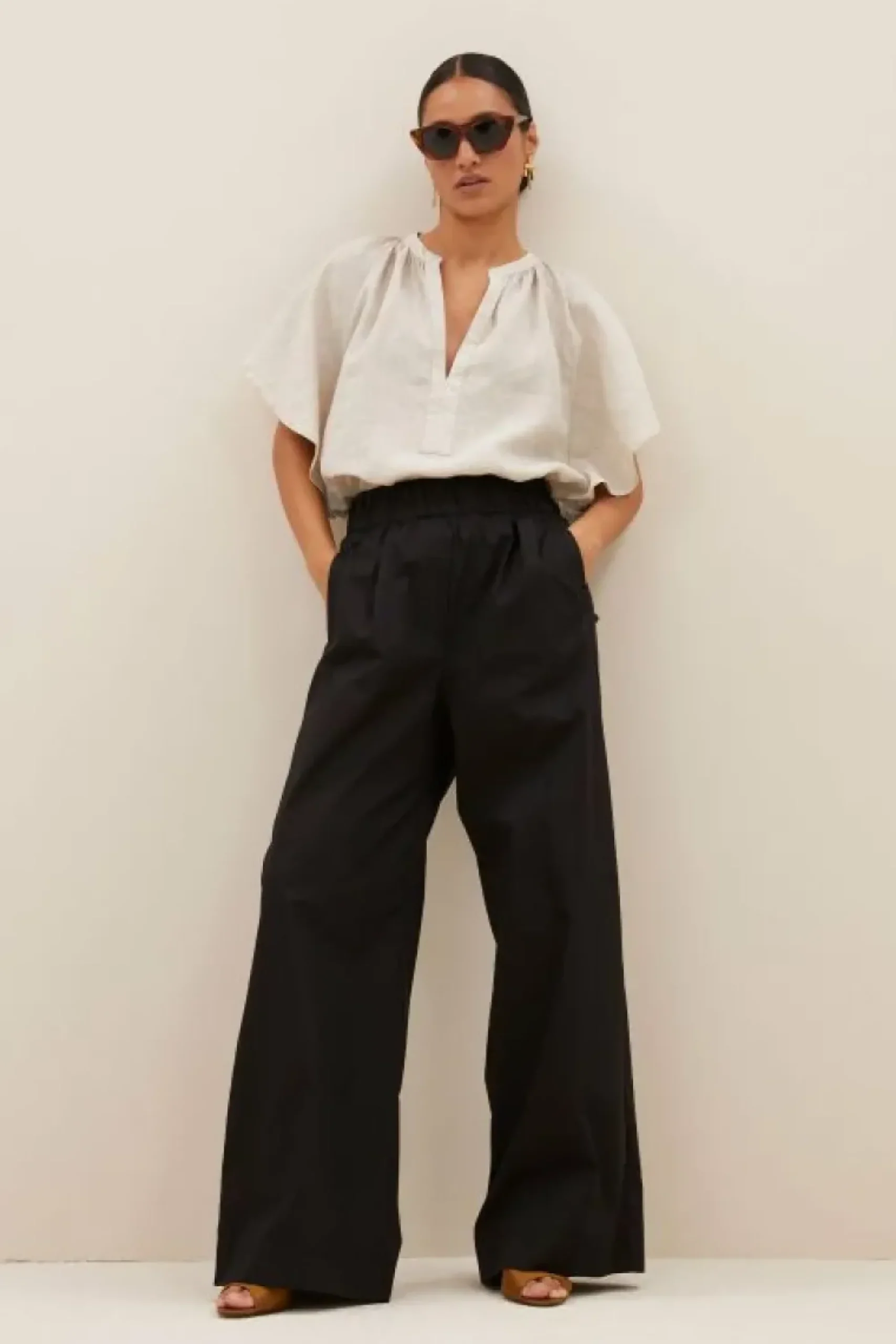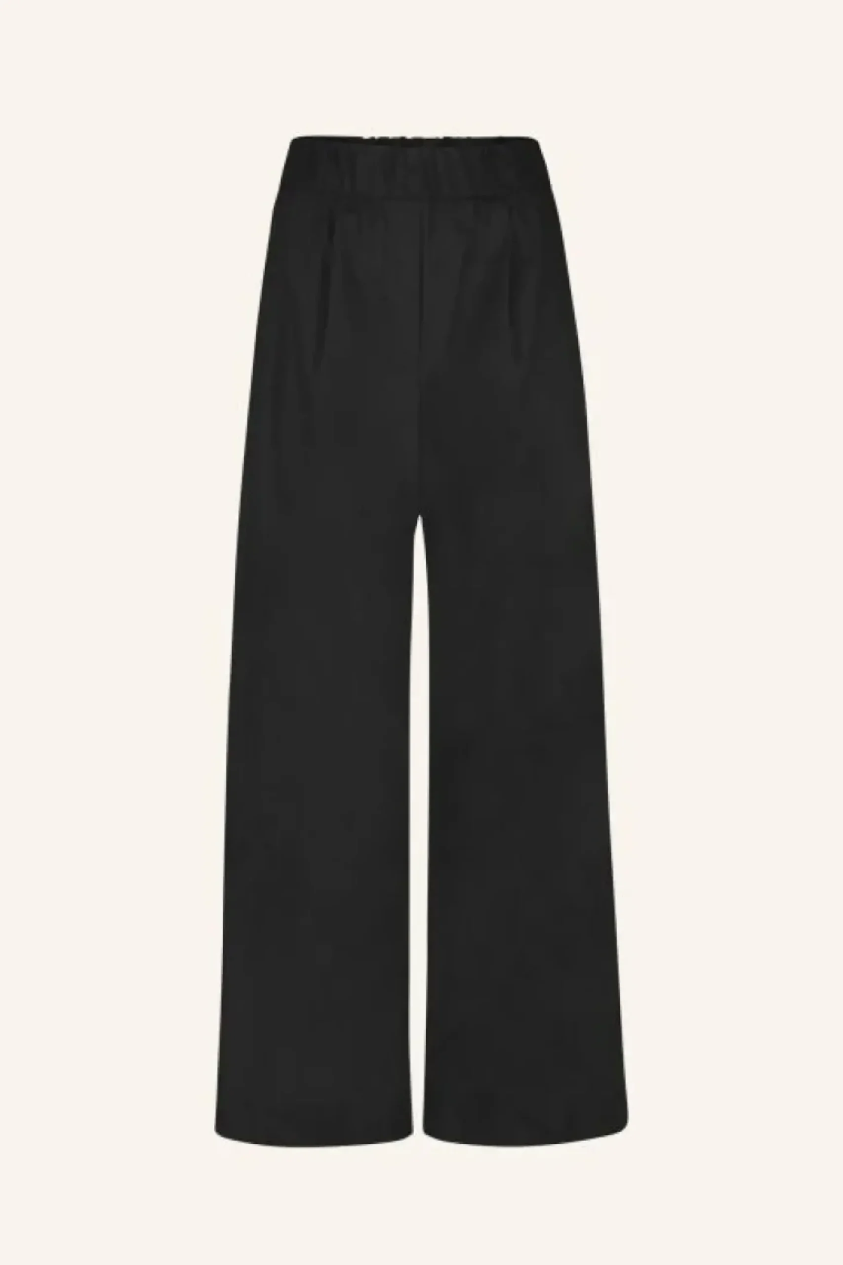 Stijlvol en casual? Dat is de benji poplin pant! De broek heeft een hoge taille met een elastieken band, plooien aan de voorkant, steekzakken en wijde broekspijpen. Gemaakt van een zachte katoen kwaliteit voor ultiem comfort. Combineer de broek samen met de vina linen blouse voor een casual look!
