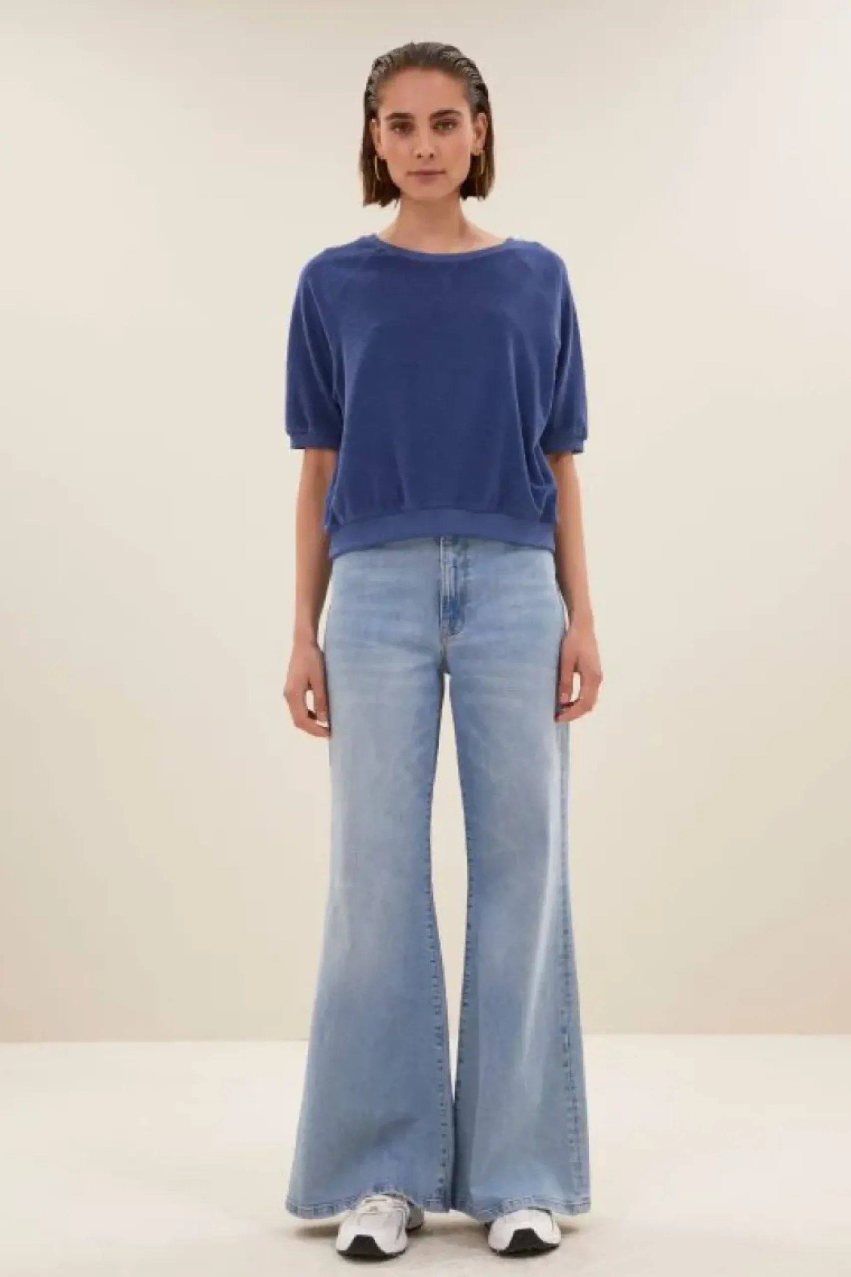 De neva slub top is een comfortabele top met een ronde halslijn. De top heeft een korte mouw en is afgewerkt met een rib boord aan zowel de onderkant van de mouwen als aan de onderkant van de top. Daarbij zit er een splitje aan beide zijkanten van de top. De top is gemaakt van een teddy sweat kwaliteit en is een echte must-have essential.